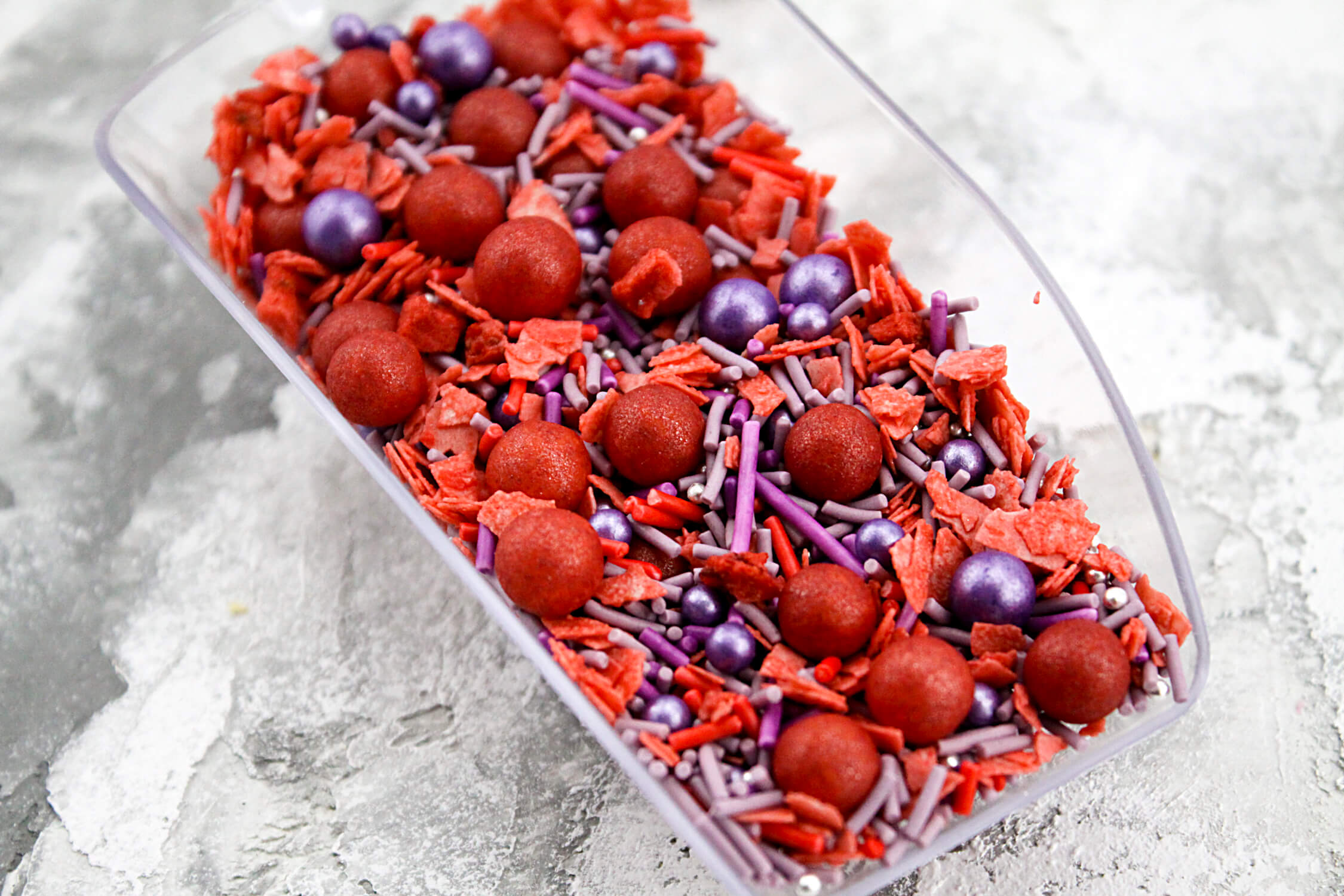 Крупные клубничные бусины сочетаются с кусочками сублимированной клубники, и всё это дополнено хрустящими криспи.
