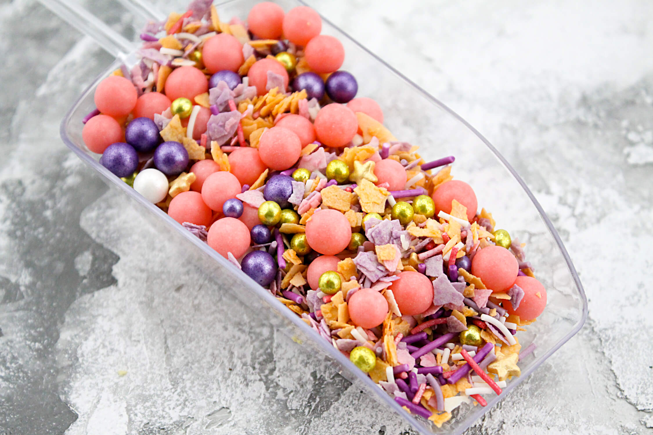 Они представляют собой вафельные хлопья, покрытые тонким слоем белого шоколада со вкусом апельсина, фиолетового батата клубники.