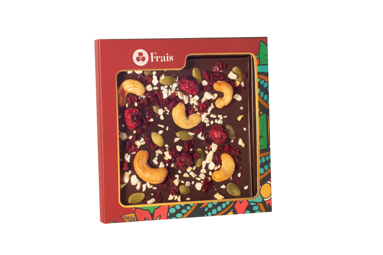 Шоколад изготовлен из темного Колумбийского шоколада с насыщенным ароматом какао с добавлением ягод и орехов. Шоколад упакован в коробку из ламинированного картона с прозрачным окном и коричневый пластиковый коррекс.
