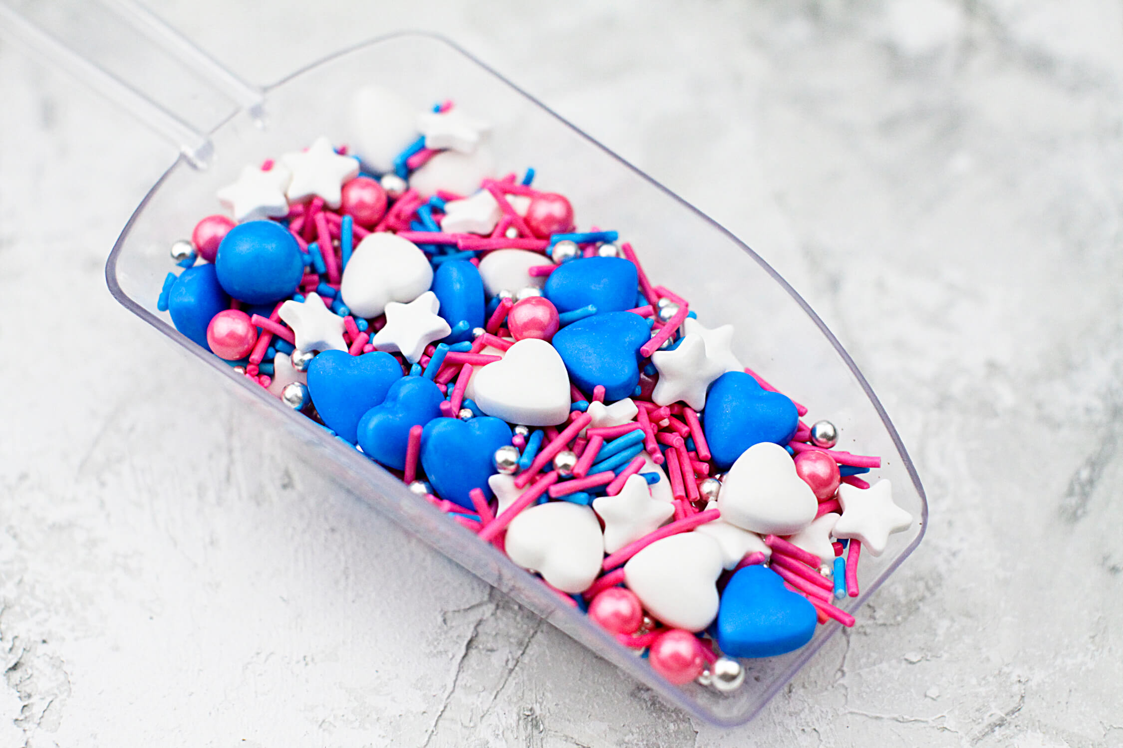 Стильный микс в бело-розово-синей гамме! Очень яркий и разнообразный по составу: синие и белые большие сердечки, белые звезды, серебряные бусины, розовые глянцевые шарики, а также вермишель.